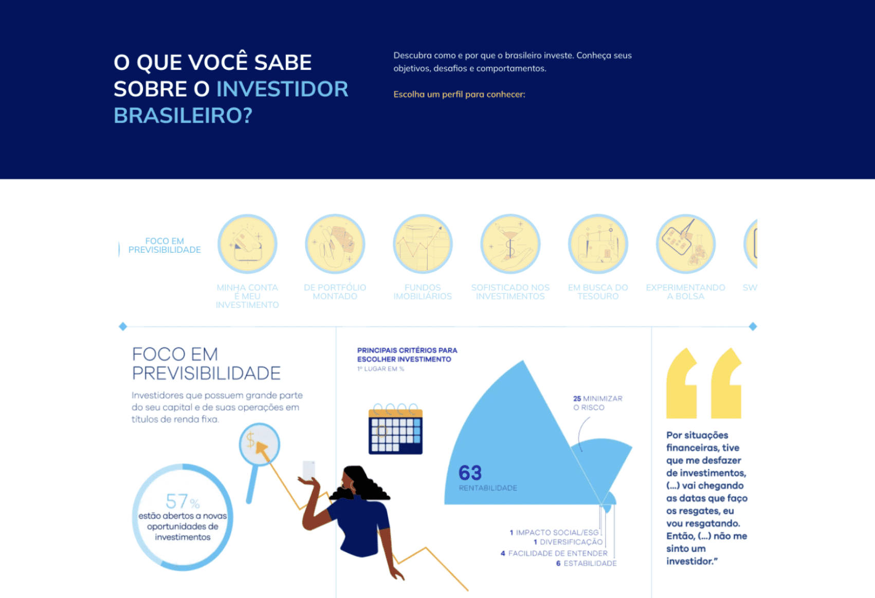 Ao desenvolver uma plataforma para identificar o perfil de investidor, enfrentamos um desafio crucial: garantir que os usuários encontrassem essa funcionalidade com facilidade e a utilizassem de maneira eficiente. Muitas vezes, investidores em potencial não compreendem completamente seu próprio perfil de risco, o que pode levar a decisões financeiras inadequadas.