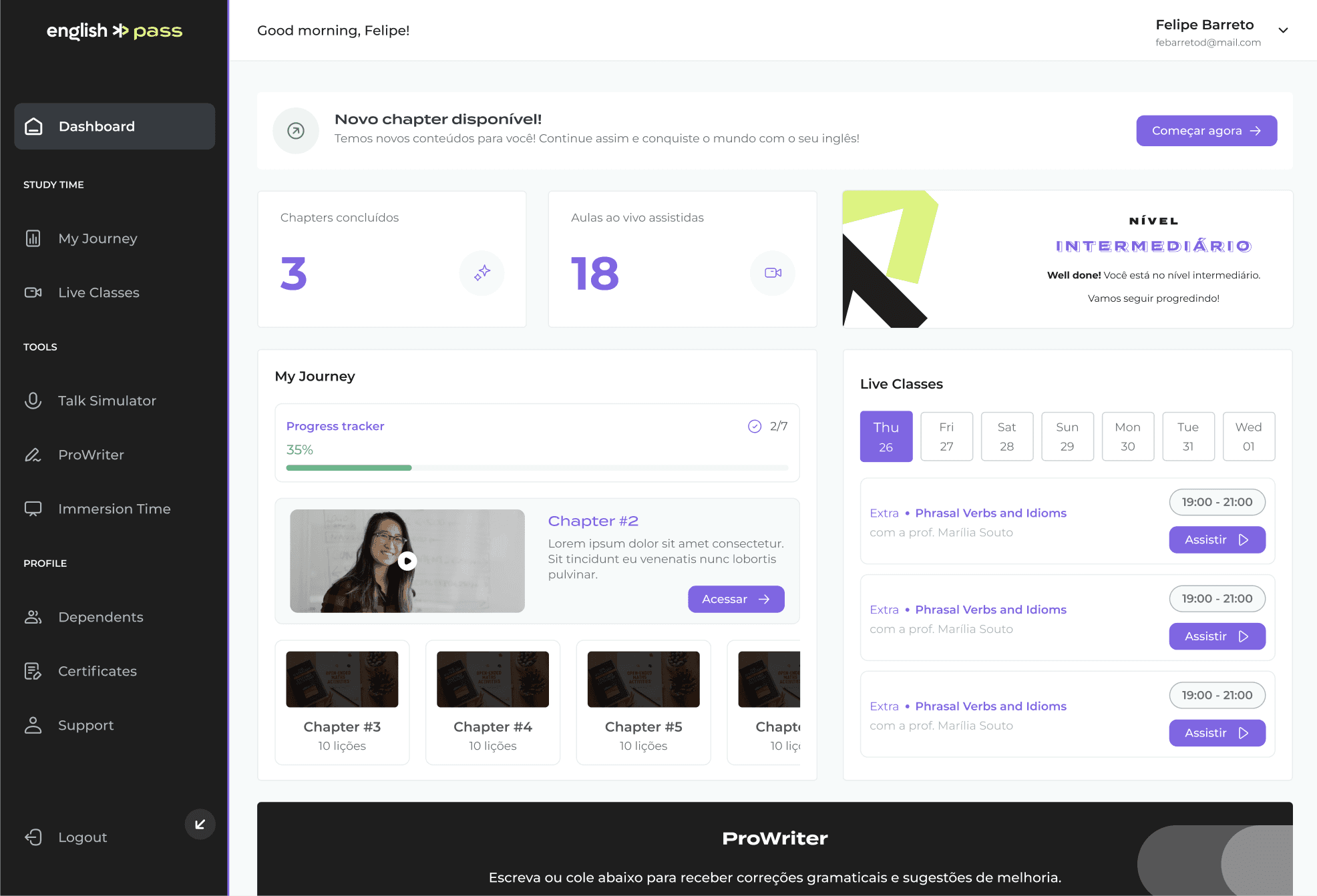 Com foco no usuário, uma interface intuitiva e acessível para tornar o aprendizado de inglês mais leve, personalizado e engajador.
